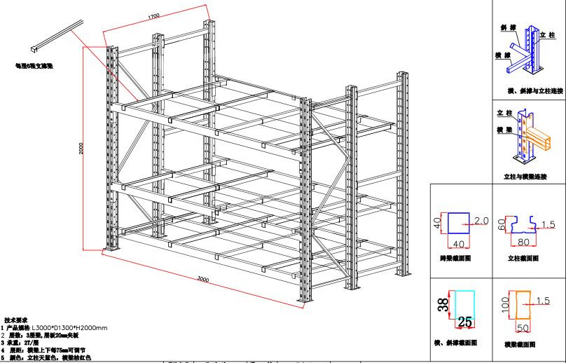 圖紙中(zhōng)是三(sān)立柱重型貨架(jià)一般承重在2至3噸以上才會(huì)做三立柱貨(huò)架優勢:更(gèng)加有效的利用(yòng)空間、降低儲存成本(běn),三立柱貨架適用於(yú)深(shēn)度大、長度長的規格貨架(jià)。