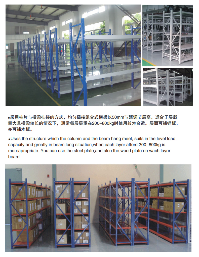 中型貨架適用於人工堆放作業,適用於存放輕、小物品;常(cháng)應用於(yú)電子、服裝、醫藥、食品、電商(shāng)倉儲、跨境電商配送中心等領域。
