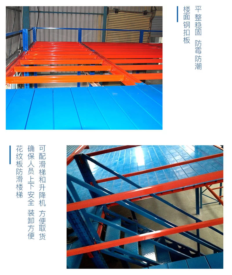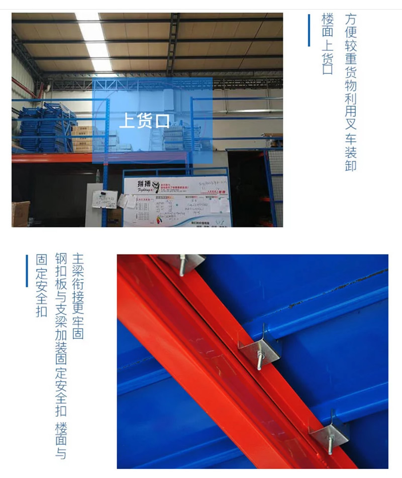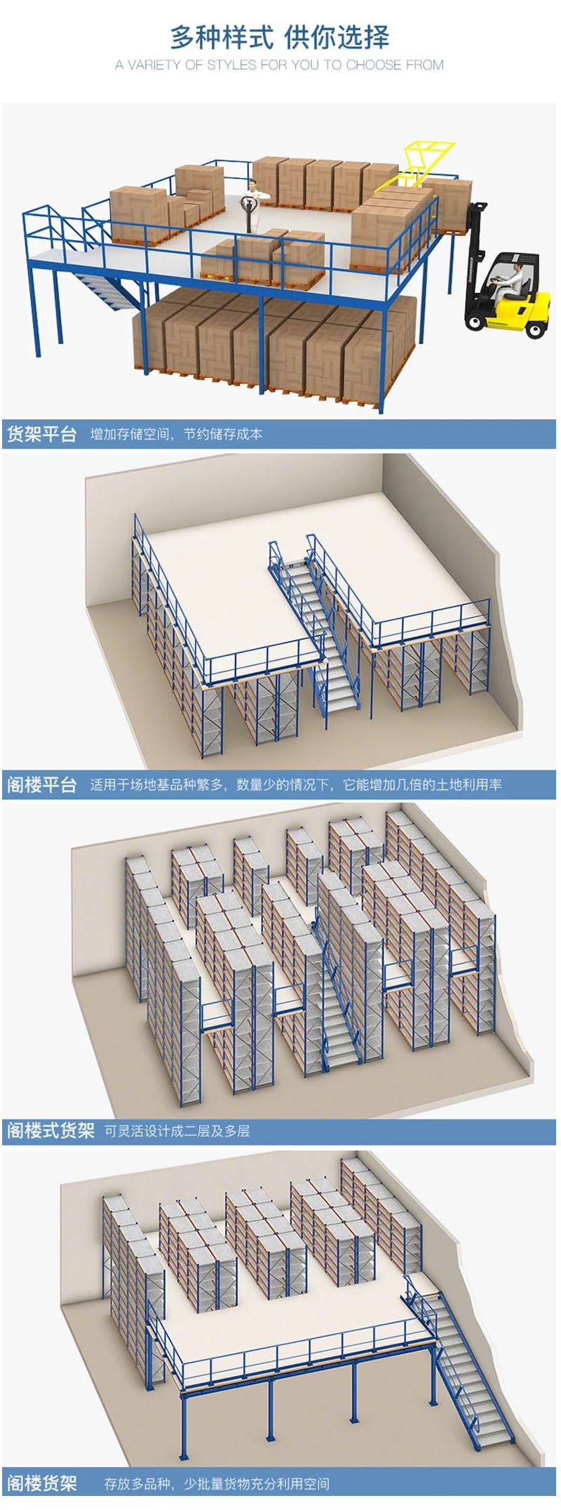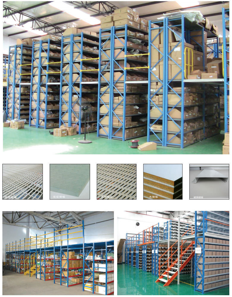 閣樓(lóu)貨架是一種充(chōng)分利用倉庫上層空(kōng)間的簡易貨架。在已有的貨架或工作場地上建造一個中間閣樓以增加儲存的麵積。閣樓樓板上一般可放(fàng)輕泡及中小件貨物或儲存期長的貨物,可用叉車、輸送(sòng)帶、提升機、電動葫蘆或升降平台(tái)提升貨物。閣樓上一般(bān)采用輕型小車或托盤牽引(yǐn)小車作業。