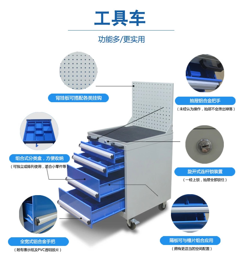 工具車適用(yòng)於工具、刀具、零部件(jiàn)在生產現場中的定置管理,使您的物品存取工作真正(zhèng)做到準時、準(zhǔn)確、高效、低耗(hào)。
