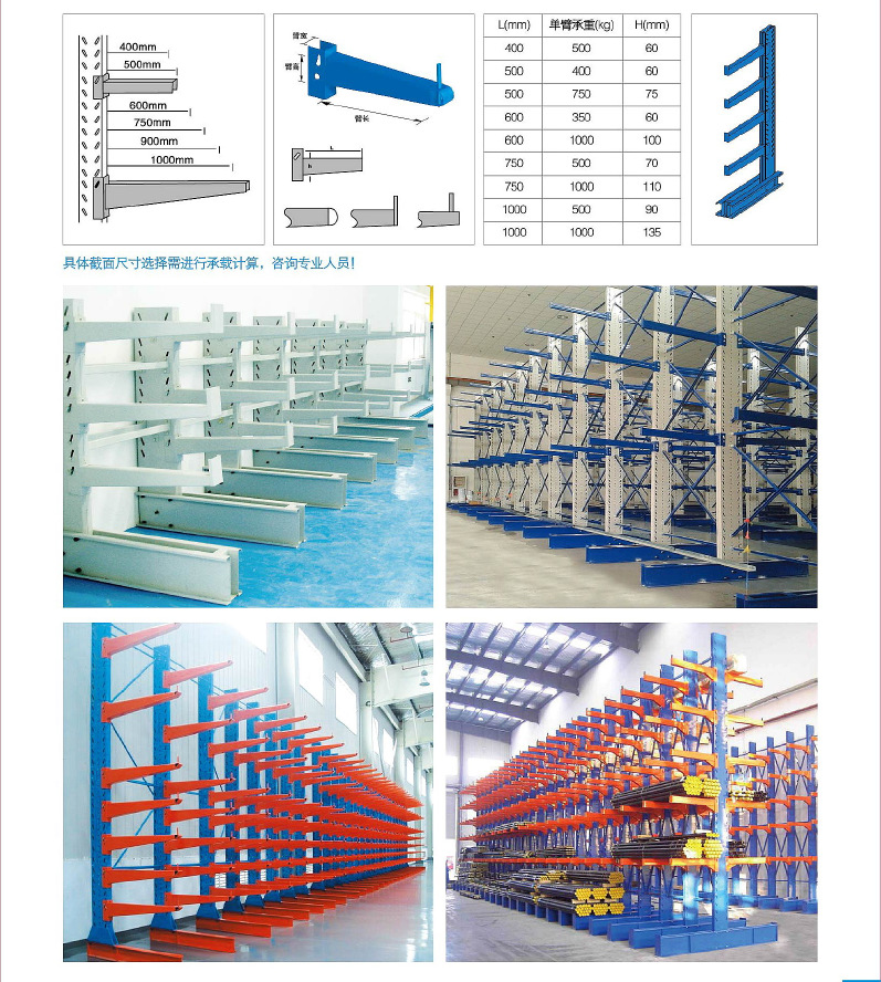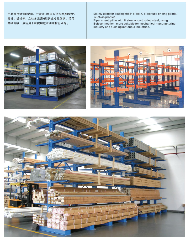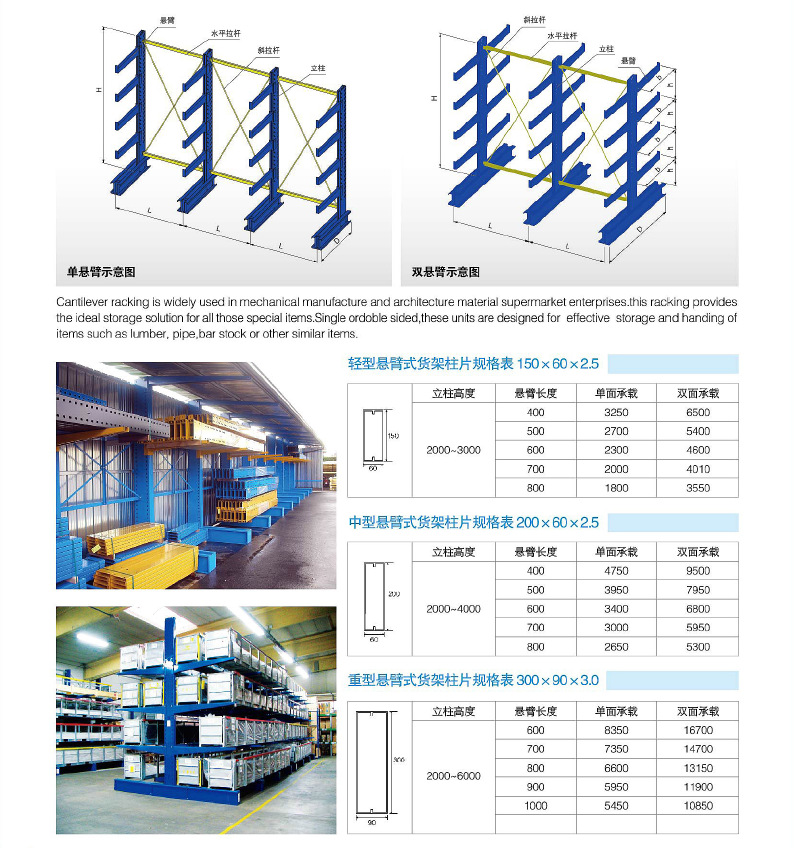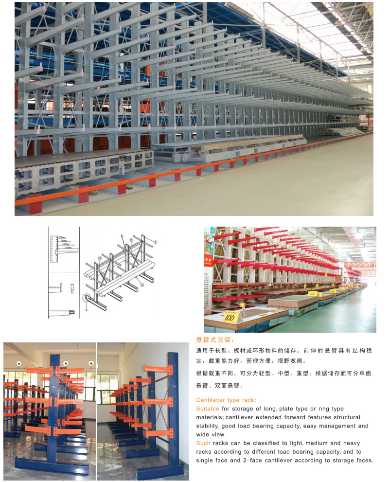 懸臂式貨架主要是由立柱片、懸臂梁、連接杆等(děng)組成的貨架(jià),其特點是前伸的懸臂結構輕巧,載重力強,對存放不規格或是長杆件物料,能大幅度提高倉(cāng)庫的利用率和工作效(xiào)率,懸臂(bì)可是單麵或雙麵。它增加了木板或鋼格板後,特(tè)別適合空間(jiān)小、密度低的庫房,管理方便、視野(yě)開(kāi)闊。廣(guǎng)泛用於機械加工及建材超市行業。