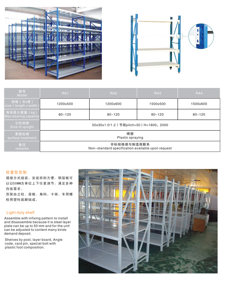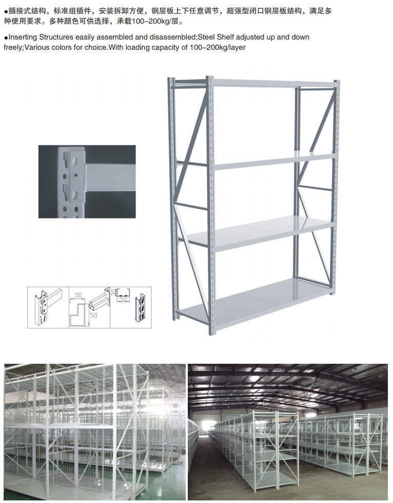 輕型貨架是(shì)非常經濟實用(yòng)方便的一款倉庫貨架,因其載(zǎi)重量較輕,故常稱為輕型貨(huò)架。貨架是由三種構件:立柱片、橫梁、層板組成。輕型(xíng)貨架整體采用(yòng)無(wú)螺釘(dìng)組合式(shì)設計,安裝拆卸方便快(kuài)捷。適合存放一些輕質小件(jiàn)貨品,是層板貨架的一種。輕型貨架(jià)的結構與中型相同,可自同拆裝,層高以5cm間距可自由調節,隻是其材料規格相(xiàng)對較小,承(chéng)載量也相對較小,此種輕(qīng)型貨(huò)架價格相對經濟,結構相對萬能角鋼貨架要穩定(dìng)牢靠,在1500cm跨度內,可承載100-200kg.表麵采用噴塑處理(lǐ),美觀整潔。 適用於存放輕中型物品,人工存取的場(chǎng)合。