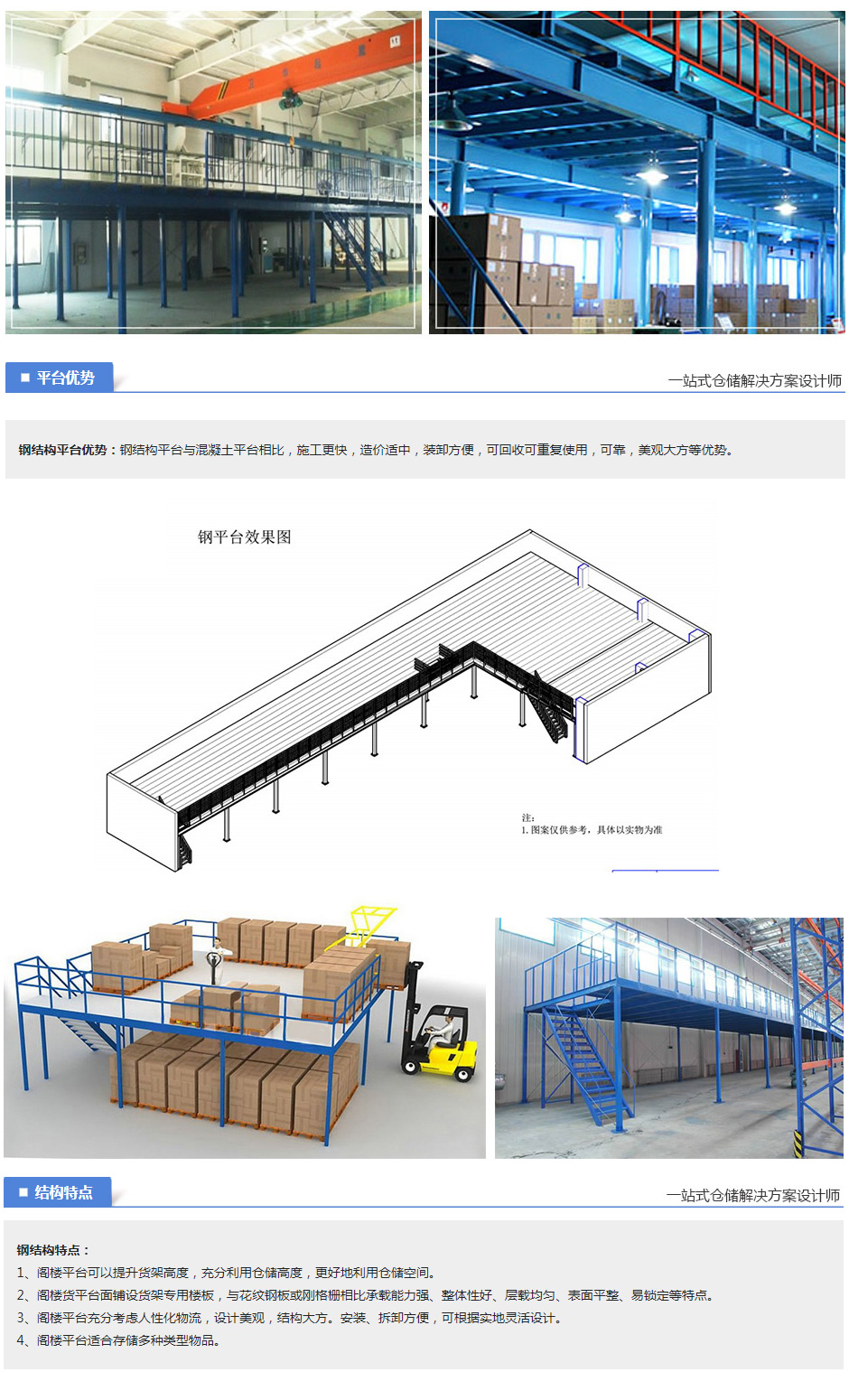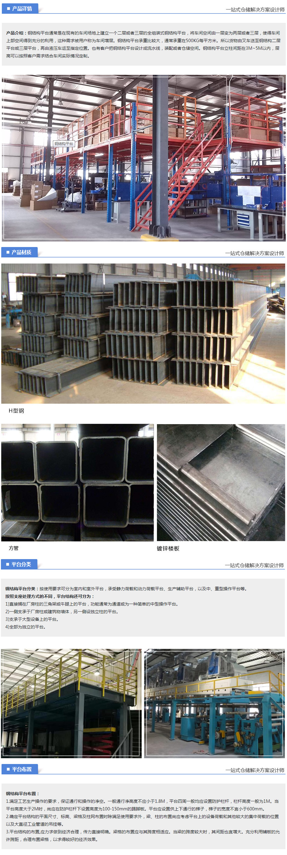 現代鋼(gāng)結構平台結構形式多樣,功能也(yě)一應俱全。其(qí)結構特點是全組裝式結構(gòu),設計靈活,可根據不(bú)同的現場情況設計並製造符合(hé)場地要求、使用功能(néng)要求及滿足物流要求的鋼結構平台。在現代的存儲(chǔ)中較(jiào)為廣泛應用。